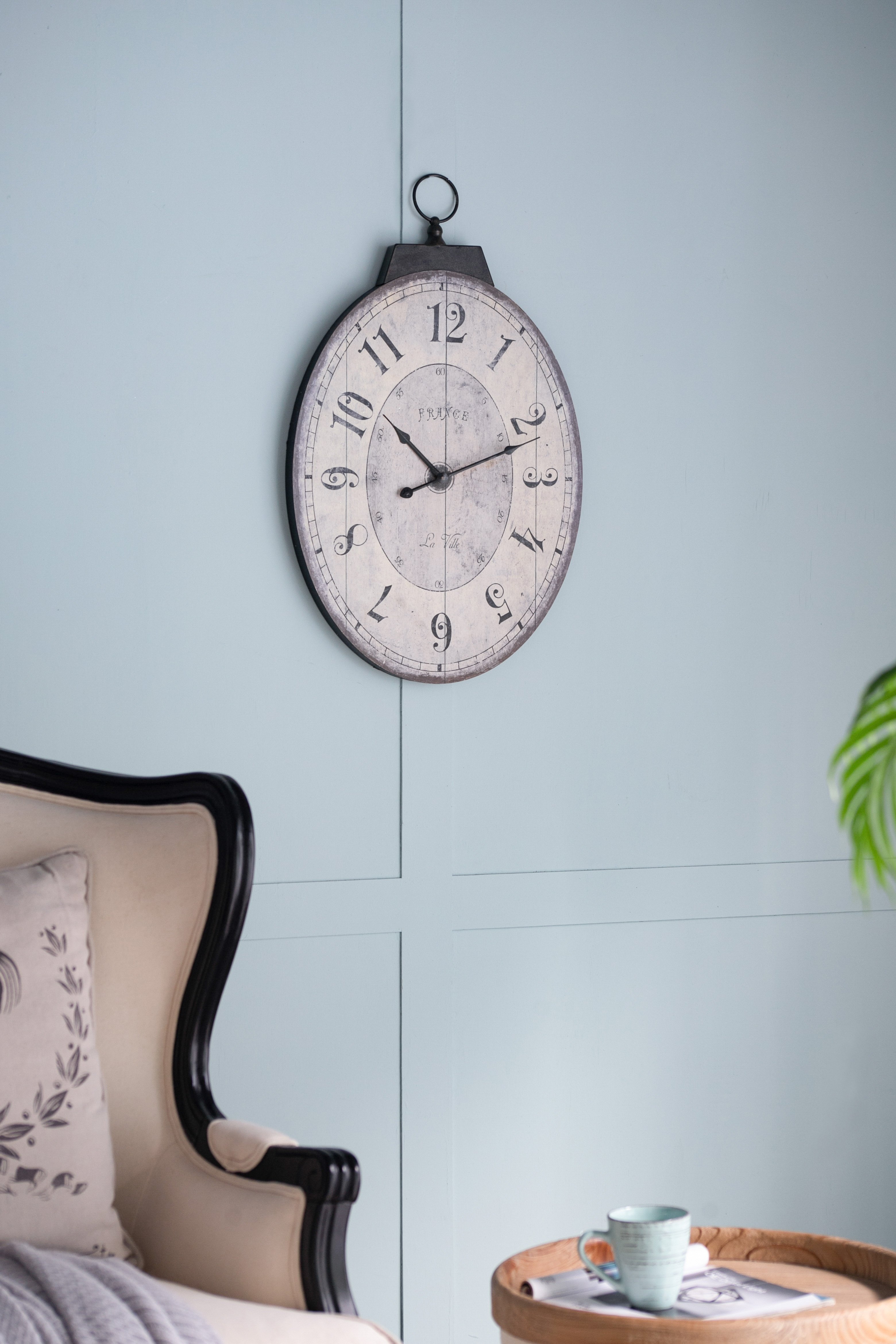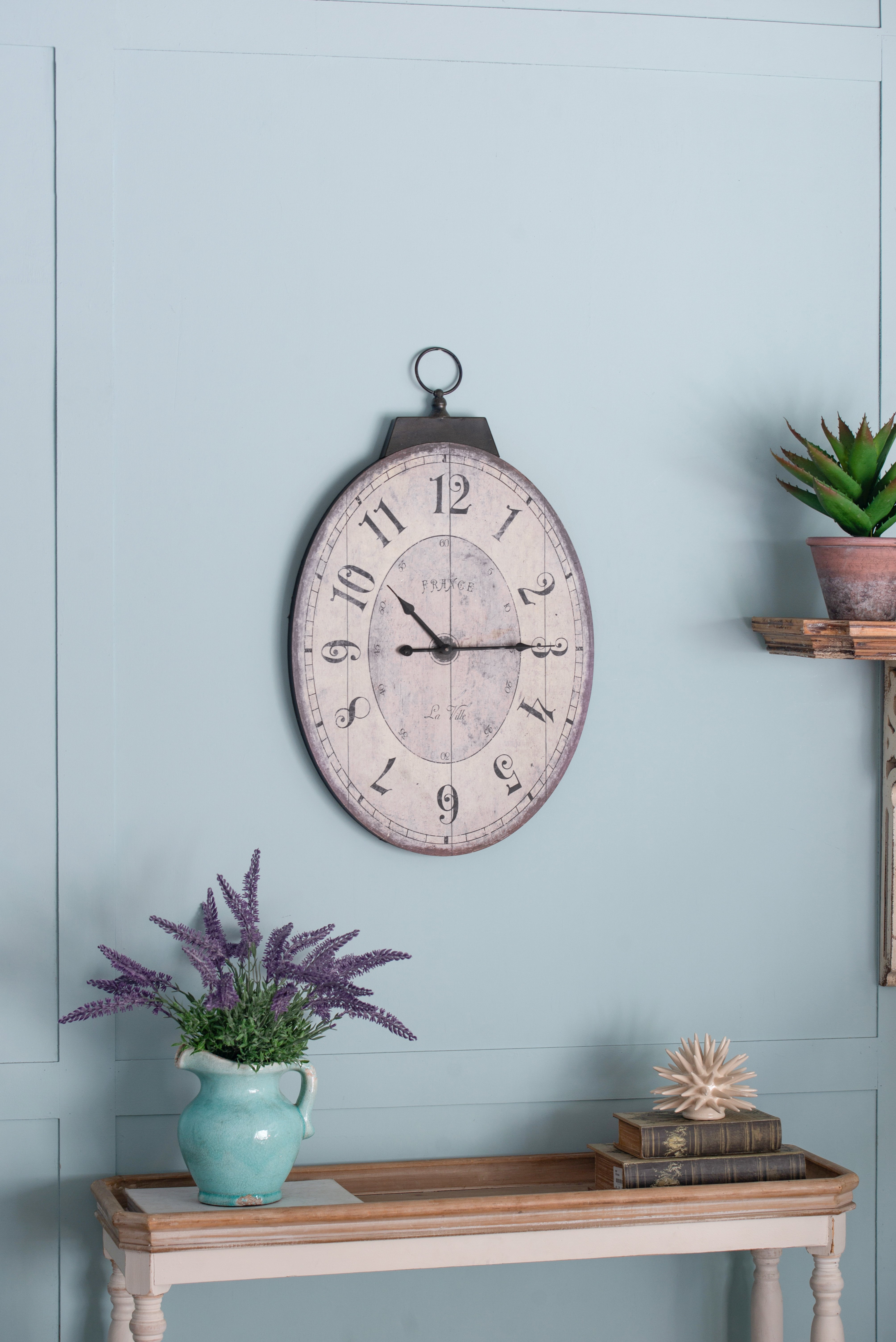 The DesignWith its simple clock face, decorative numerals, and weathered look, the Thaddeus Oval Wall Clock from the Southern Living Collection adds an understated elegance to any space. Hang above an entryway table, on a kitchen wall, or above the living room mantle for a warm yet sophisticated look. The Thaddeus Wall Clock offers a casual, refined look that fits a variety of decors.