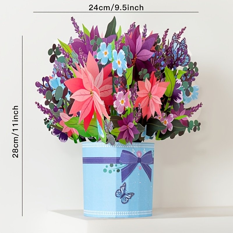 Occasions for Holiday Bouquet Card:This sweetheart floral greeting card pops up as a vibrant bouquet with a collection of colorful blooms in shades of pink; purple; and blue; and displays a striking blue morpho butterfly. It can be used as a gift for celebrating a special occasion; or simply sending a just because card. And it makes a beautiful standalone centerpiece or display for home; office; apartment; etc.Allergy-friendly; portable; and long-lasting; these flowers will never die; nor need