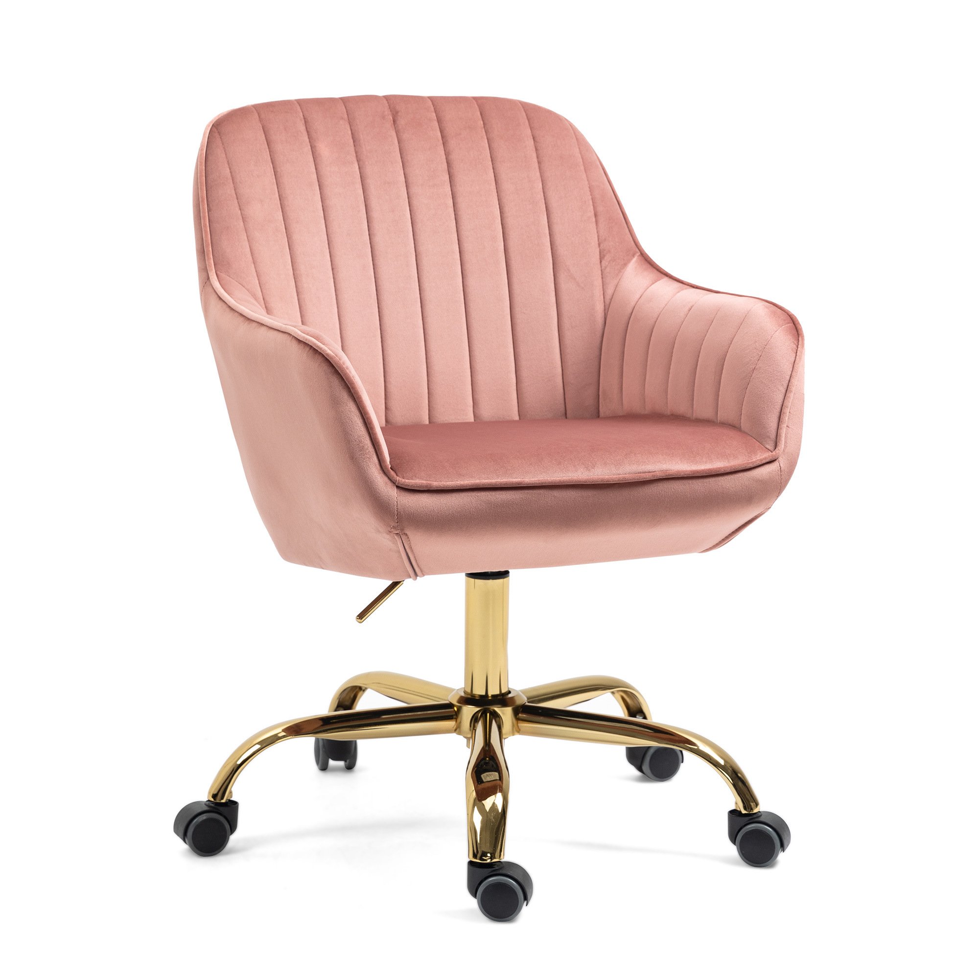 360° Pink Velvet Swivel Chair With High Back, Adjustable Working Chair With Golden Color Base