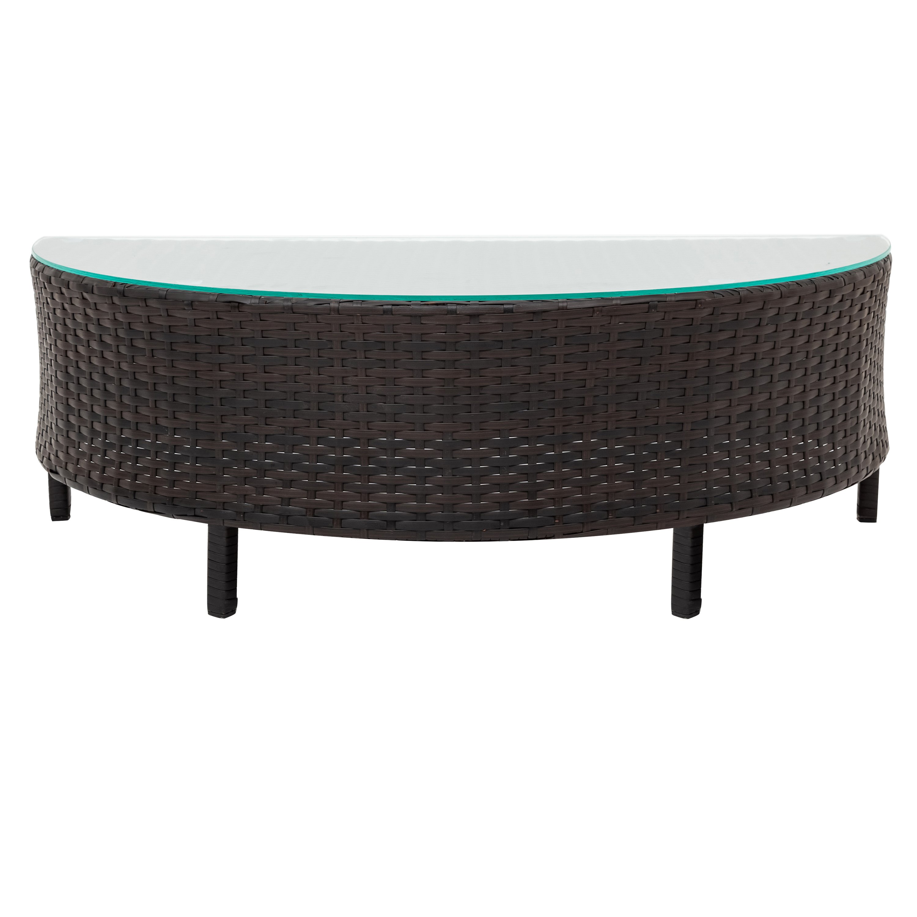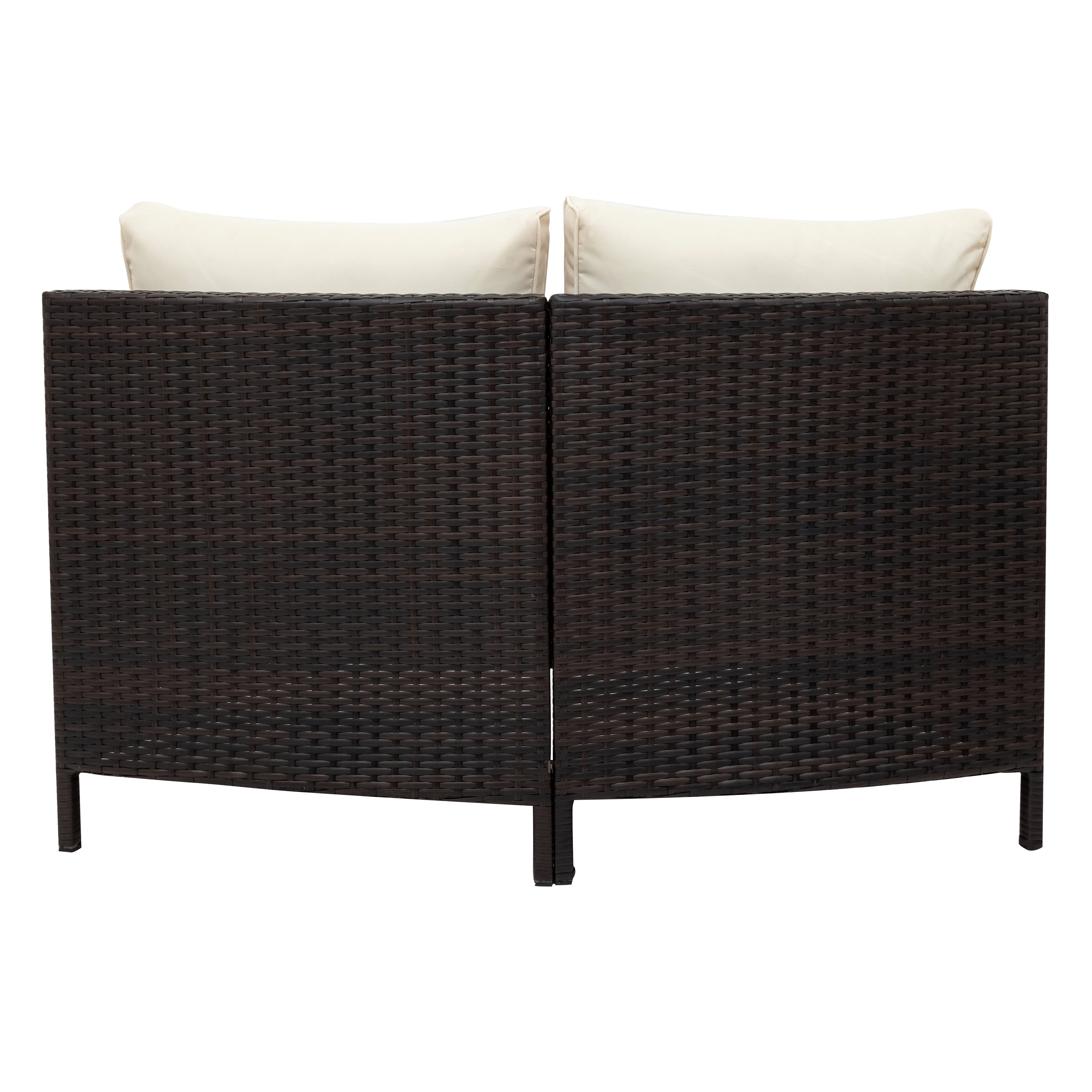 This patio sofa set includes 4pcs 2-person sofa and 1 half-moon tempered glass top table as well as 8 thick pillows&4 cushions. Constructed with solid steel frame; each seat can hold max 250lbs. Covered by strong but light-weighted PE rattan; this 5pcs rattan sofa set is designed to all-weathered with UV resistant and water-resistant.