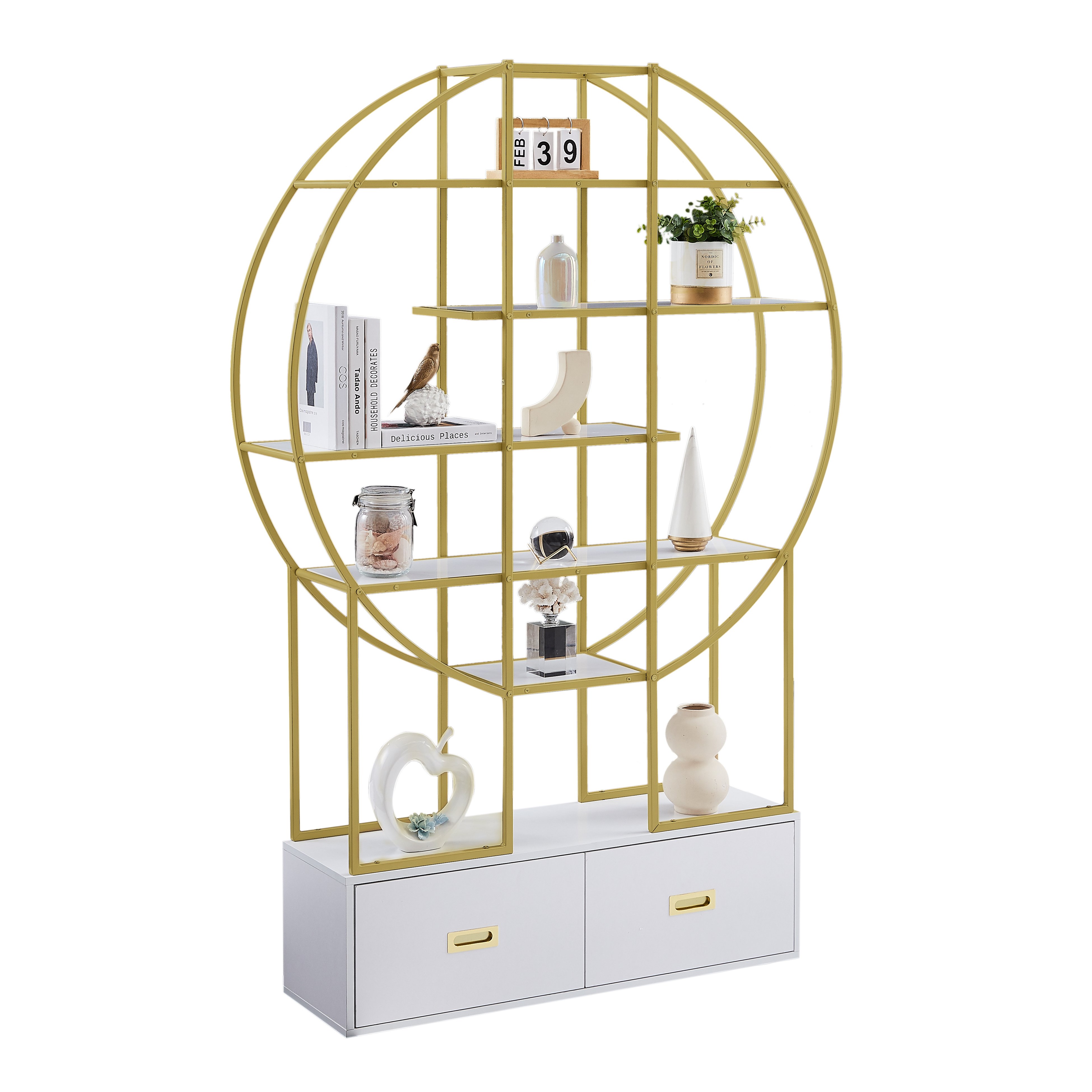 70.8 Inch Round Office Bookcase Bookshelf, Display Shelf, Two Drawers, Gold Frame