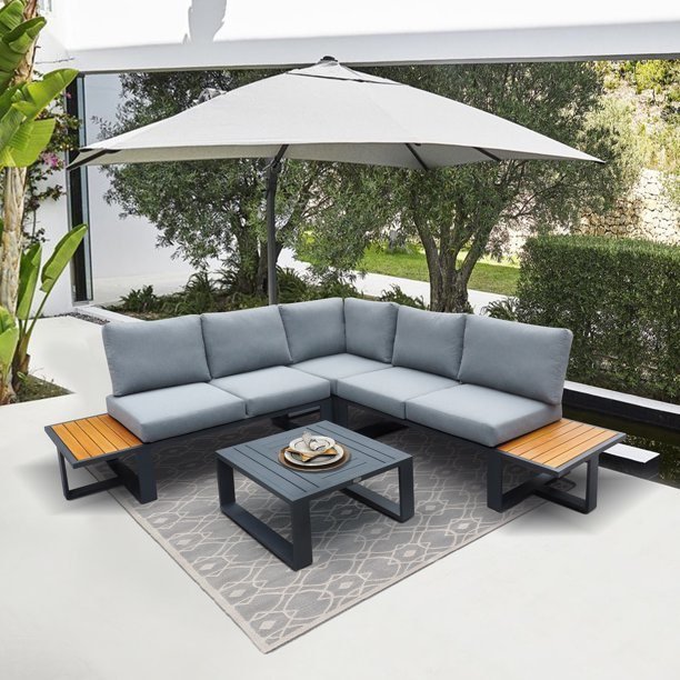 1.Modern Design Patio Furniture Set: ATR ART TO REAL patio furniture set including 5 pieces single chairs, 2 pieces coffee tables. Black powder-cated aluminum frame with gray cushions, imitation wood aluminum coffee table, which is a perfect combination of modern style,creats a sense of luxury at your lawn, yard, living roon, etc.