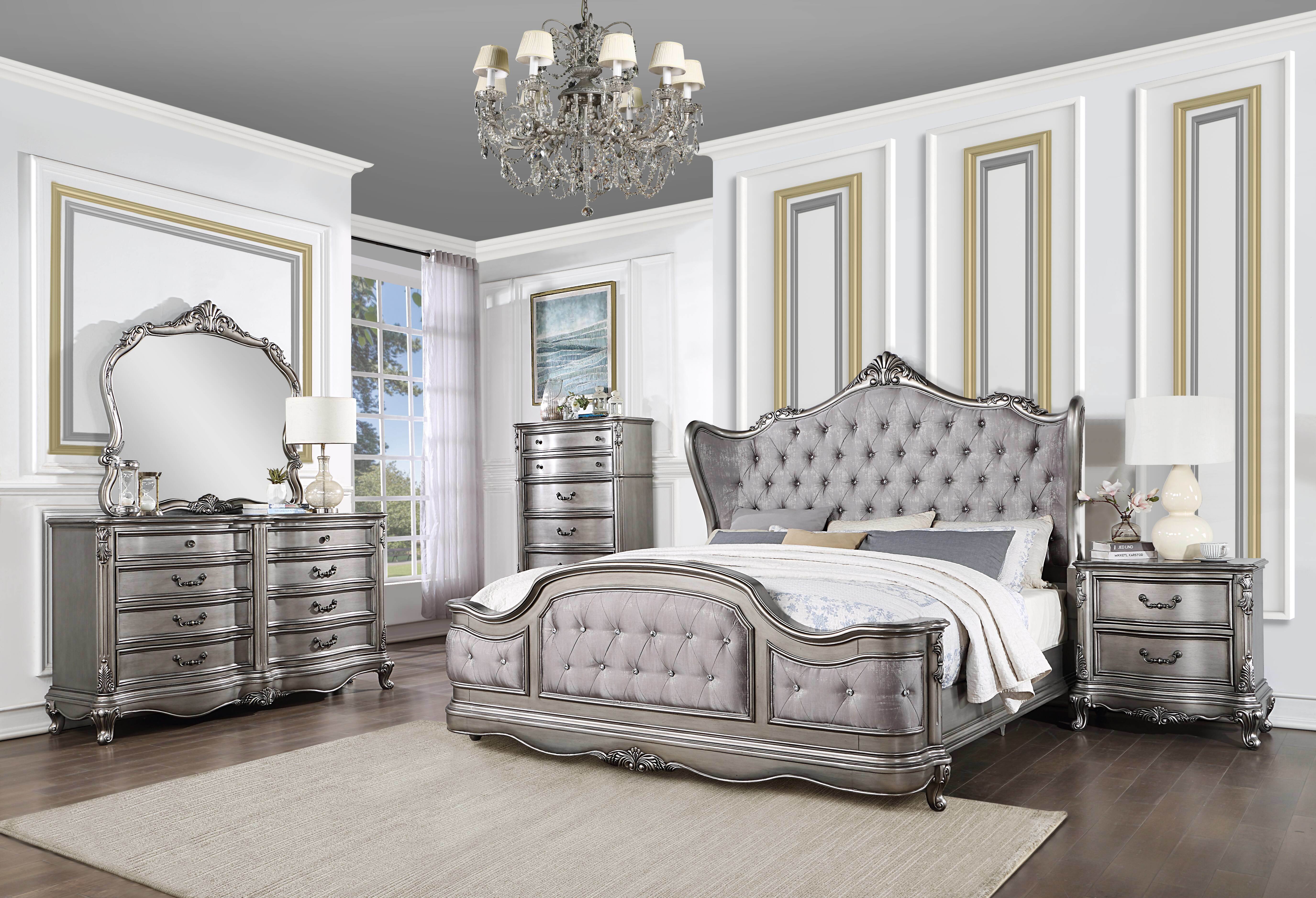 RomanceCreate the feel of a European chateau in your bedroom with the Ausonia collection. Gathering inspiration from vintage Rococo design, featuring intricate carvings that embody the period. The wingback headboard is a classic design is accented with crystal-like button tufting that adds texture and a touch of glimmer for a regal look. The antique platinum finish has a brilliance to it that draws attention to the eyesProduct Details•Mirror Beveled (1")