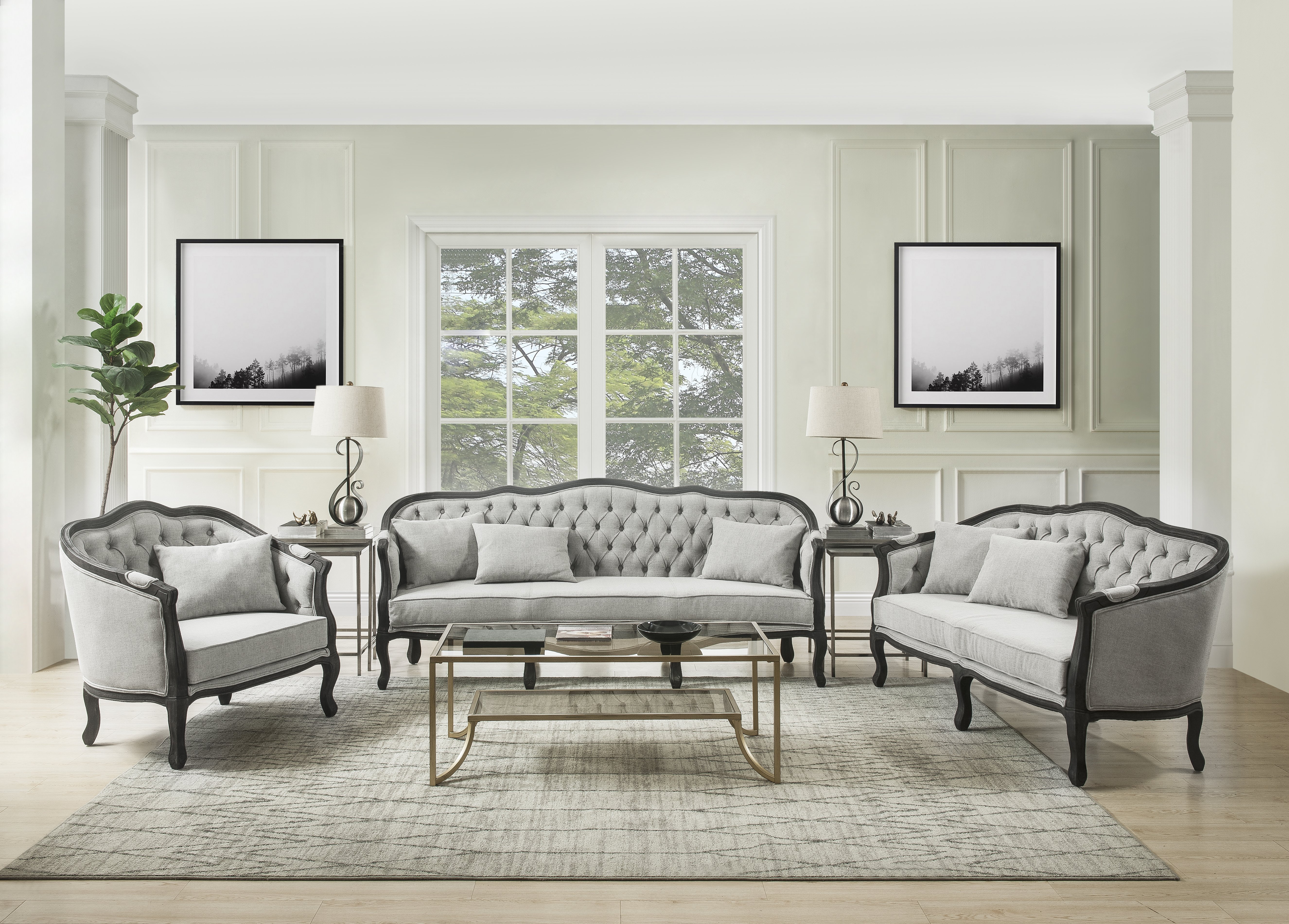 RomanceWith a nod to vintage French design, the Samael is a modern interpretation of a camel-back sofa is distinguished by its exposed, and beautifully carved, wooden frame that wraps you in comfort. Its curved frame with a winding front rail sits off the floor on carved cabriole legs. Enveloped in gray-colored linen, the piece features a deep bench seat cushionProduct Details•Seat Construction: Pocket Coil•Tight Back & Loose Seat Cushion•Wooden Inner Frame•Foam Density: D24•Cushion Thickness: 6"•Wooden Legs•1 Pillow Included