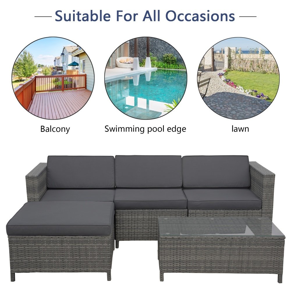Product Material:The 5 piece wicker outdoor patio furniture set is made of hand-woven rattan, and the sectional sofa furniture is designed in a modern and elegant way. It is perfect for your balcony, porch, backyard, deck, garden, and lawn!Product Design:The 5 piece wicker outdoor sofa sets with high quality seats and thickened back sectional cushions bring you extraordinary comfort. You can freely and flexibly combine the backyard patio furniture couch sets based on your different needs. Enjoy your truly relaxing time!
