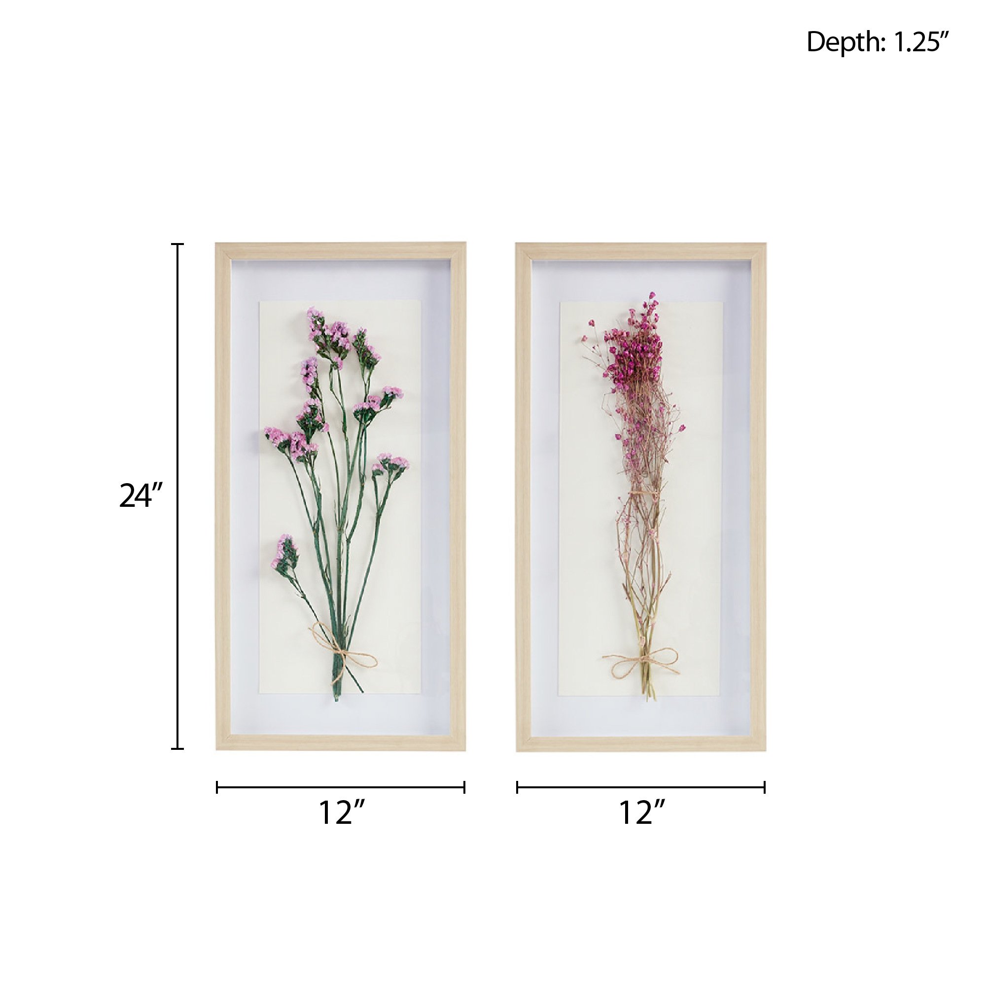 DESCRIPTIONAdd a fresh touch to your home with the Madison Park Avant Garden Dried Flower 2-piece Shadow Box Wall Decor Set. This shadowbox framed art features real sundried flowers that are dyed and placed under glass, for a unique and naturally feminine look. Each piece is then cast in a natural wood color MDF frame highlighting every branch and petal beautifully; while Sawtooth fixtures on the reverse make each piece easy to hang. Place this 2 piece shadowbox set together as a focus piece or hang separately to give any space the perfect soft floral and farmhouse update. Flowers may fade or discolor over time, due to the natural properties of real flowers.PRODUCT DETAILSSee below2 Pieces of Shadowbox: 12"W x 24"H x 1.25"D (2)Glass Size: 10.9"W x 22.9"HMATERIALPolystyrene: 30% Glass: 20% Paper: 20% MDF: 20% Flower: 10%