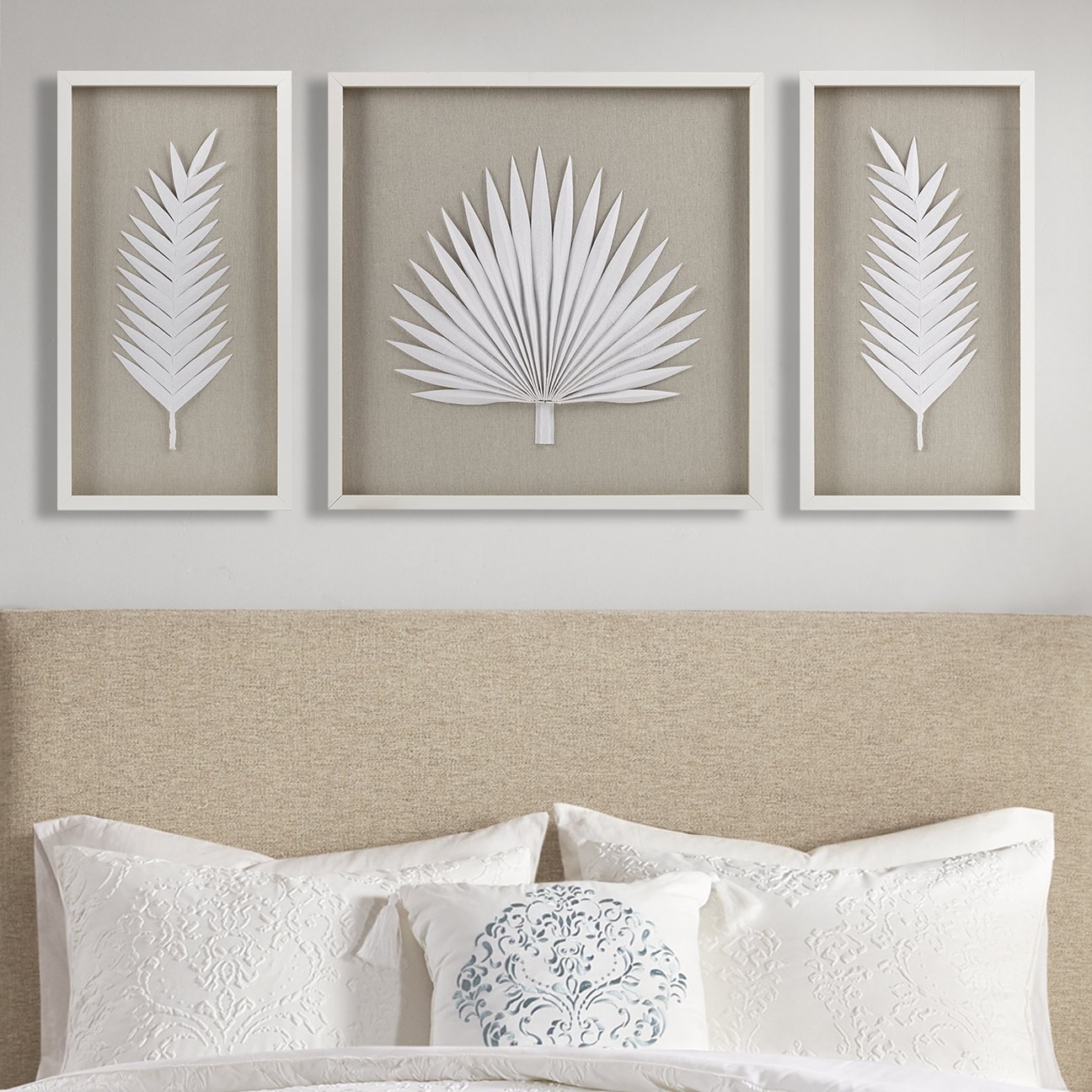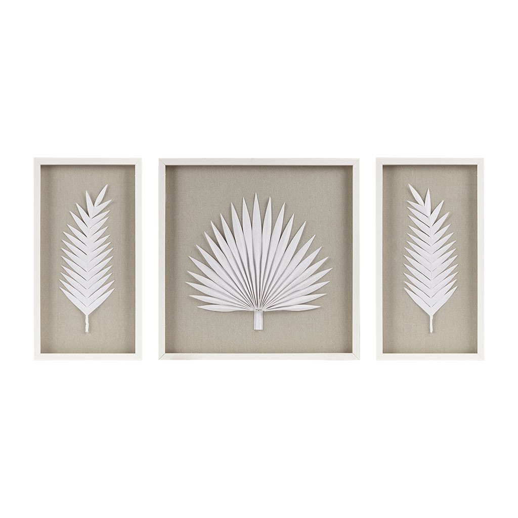 DESCRIPTIONRefresh your space with the coastal elegance of the Madison Park Sabal Framed Rice Paper Palm Leaves 3-piece Shadowbox Wall Decor Set. Each shadow box features a handmade, rice paper palm on a soft linen ground for a naturally modern and unique botanical design. Placed under glass and finished with a white frame for an elevated, gallery look and feel. 2 D-rings on the reverse of each piece makes this 3 Piece set easy to hang in any living room, entryway, or bedroom; Hang this set together for a large focus wall decor or hang pieces separately to fit any space and tie a room together. Spot clean only.PRODUCT DETAILSSee below1 Center Piece: 25.2"W x 25.2"H x 1.2"DCenter Piece Glass Size: 24"W x 24"H2 Side Pieces: 13.39"W x 25.2"H x 1.2"D (2)Side Piece Glass Size: 12"W x 24"HMATERIALPaper: 40% MDF: 20% Glass: 20% Polystyrene: 15% Linen: 5%