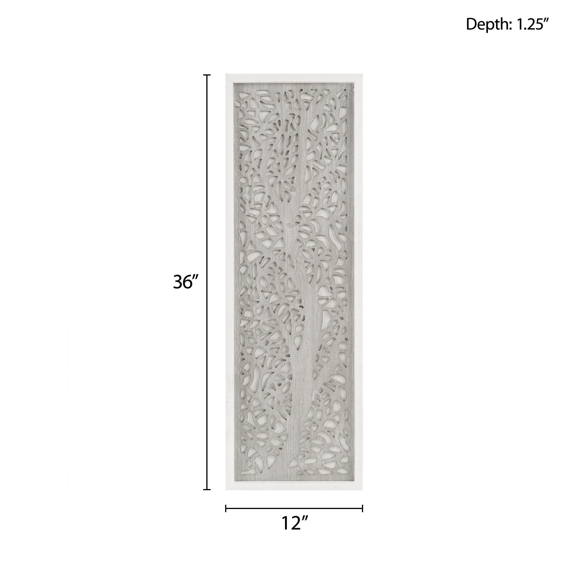 DESCRIPTIONRevive your home with our Madison Park Laurel Branches Laser Cut Tree Framed Panel Wall Decor by Artist Emily Warne. This alternative wall art features a laser-cut MDF botanical branch design in a grey tone for a fresh and stylish touch, while the 100% fir wood frame features a whitewashed finish adding a natural and modern update. 4 D-rings are finished on the reverse allowing you to hang this piece both vertically or horizontally, making this beautiful botanical panel piece an easy addition to any room or decor. Measuring 12x36" and featuring 4 D-rings on the reverse, easily hang this piece both vertically or horizontally for a beautiful botanical addition to any room or decor.PRODUCT DETAILSSee belowOverall: 12"W x 36"H x 1.25"DMATERIALMDF: 60%Fir Wood: 40%
