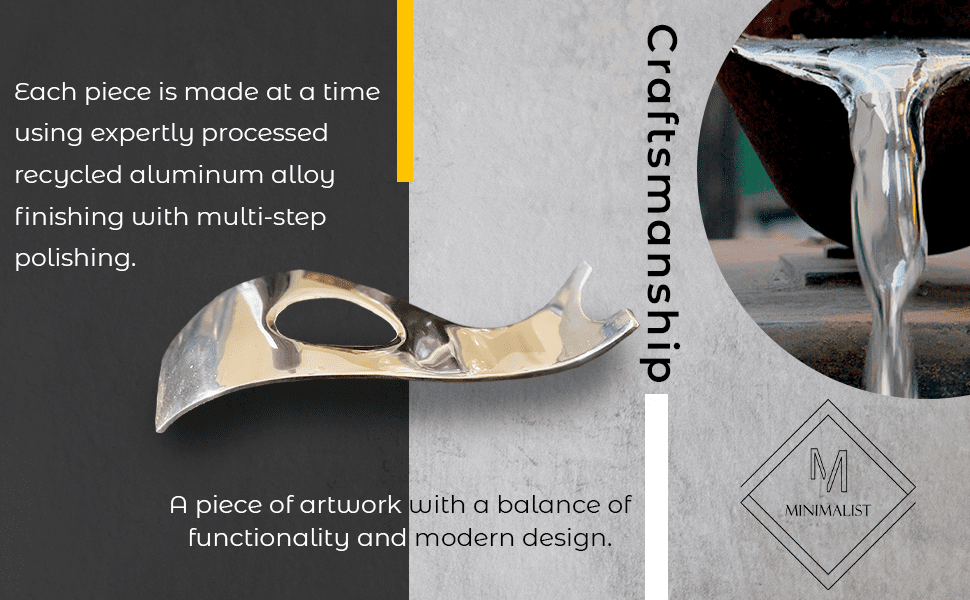 Artfully arrange your bar area with this minimalist; decorative bottle holder showcasing a beautiful design and smooth chic; wavy finish.MINIMALIST DESIGN. Simplicity; clean lines; monochromatic accent; and minimalist styling make this wine bottle holder an essential piece for modern decor.MULTI-PURPOSE AND FUNCTIONAL. This elegant bottle holder design allowed any bottle (wine; tequila; etc) to rest with style. Simply enjoy it for its luminous beauty as a decoration accessory.CRAFTSMANSHIP. Each piece is made at a time using expertly processed recycled aluminum alloy finishing with multi-step polishing creating a piece of artwork with a balance of functionality and modern design.ECO-FRIENDLY.A sustainable product made of recycled aluminum that helps reduce energy usage during the making process while decreasing landfill waste.ARTWORK. This bottle holder hits a high note with its wavy; elongated; minimalist shape and hand-cast chic finish; an artistic addition to any bar or tabletop. Make it unique down to the last detail.Dimensions: 9" x 3" x 2"Weight: 5.5 oz.Directions:Wipe with a dry cloth. Hand-wash only.* Bottle not included.
