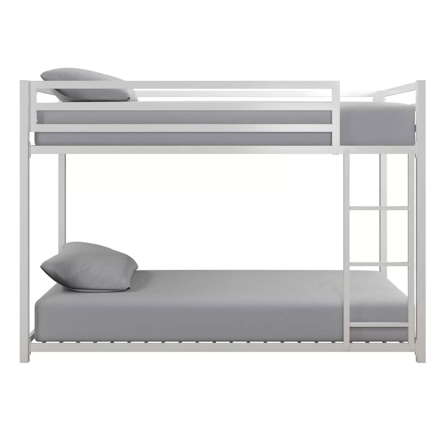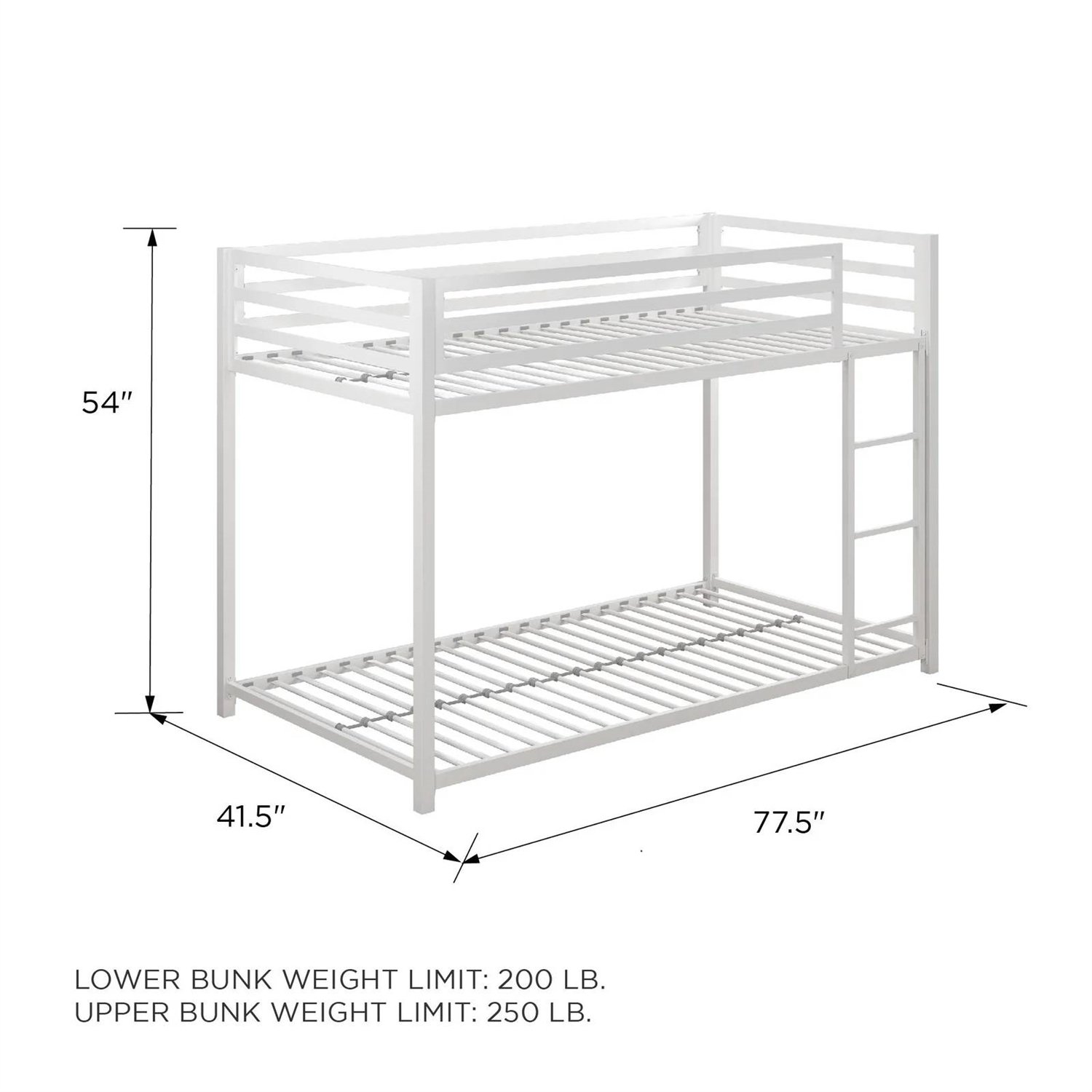 • Twin over Twin size Modern Low Height White Metal Bunk Bed