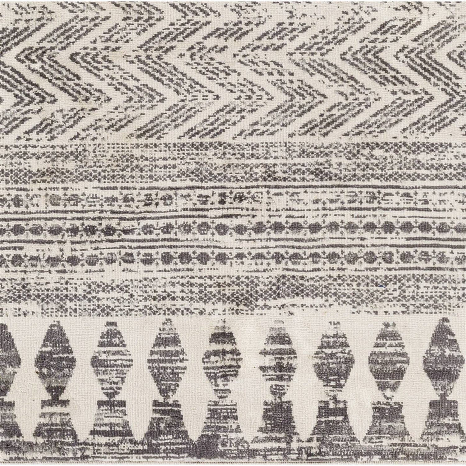 Ground your living room, bedroom, or home office with the laid-back modern style of this 8-ft. x 10-ft. Grey Ivory Chevron Stripe Geometric Boho Style Area Rug. It features bands of geometric patterns in shades of gray and ivory. This 8-ft. x 10-ft. Grey Ivory Chevron Stripe Geometric Boho Style Area Rug is power-loomed from polypropylene and distressed for a vintage look. Its .28" pile height is cozy underfoot. To care for this, vacuum with no beater bar/rotating brush. For extra cushioning and to prevent this rug from slipping, we recommend adding a rug pad (sold separately) underneath. This 8-ft. x 10-ft. Grey Ivory Chevron Stripe Geometric Boho Style Area Rug completes the look in any industrial, rustic, or bohemian setting.