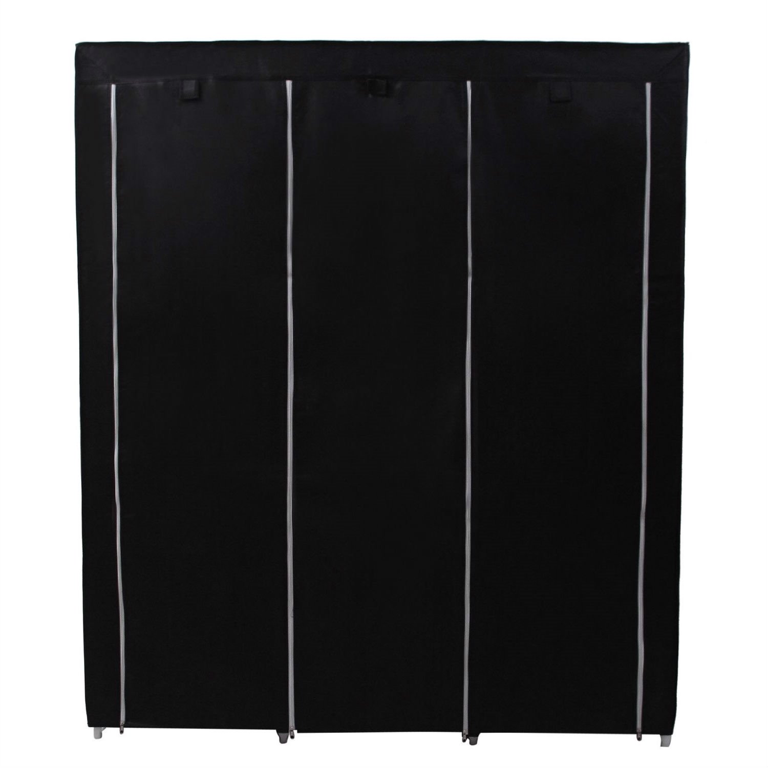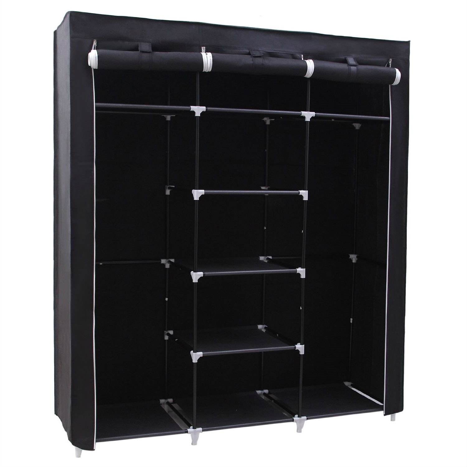 Protect your seasonal clothes or daily accessories with this Steel Frame Black Fabric Portable Wardrobe Clothes Closet with Storage Shelves. It makes a great addition to any home with storage issues. 2 hanging rods and 9 shelves offers roomy space for hanging clothes and storing garments or other stuffs, like shoes, bags, baby toys, hats etc. The fabric cover protects your garments from dust, moths and dirt, and then makes your room neat. When visitors come, you can just unfold the roller shutter to hide your clothes and other stuffs. This closet organizer will provide you with a clean and comfortable life space.