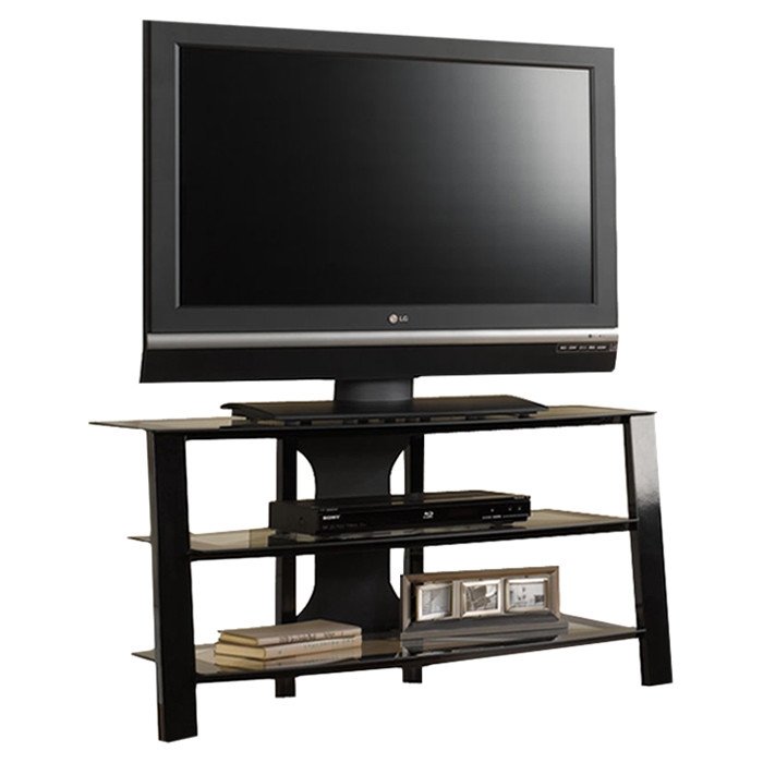 • Contemporary 40-inch Black Metal TV Stand with Clear Glass Shelves