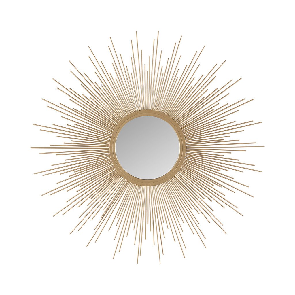 DescriptionAdd a modern and glamorous touch to your space with our Madison Park Sunburst Mirror. A stylized iron frame is featured in a sphere design creating beautiful dimension, while the gold foil adds a rich sheen and luster. The keyhole hanger feature on the reverse of the mirror allows for effortless hanging on your wall. Incorporate this wall mirror into your decor, for the perfect combination of chic luxe and metallic flair. Mirror is sold as a single piece and does not come as a set; for the complete look purchase other size for a stylized cluster or hang individually as a focus piece. The larger piece measures 29.5" with 8"D mirror size, while the smaller piece measures 14.5" with 3.875"D mirror size. Handle with care; Gently wipe clean with a damp clothProduct Details29.5" DiaOverall:29.5"Dia x 0.98"DMirror:8"DiaMaterialIron: 80%Mirror: 10%MDF: 10%
